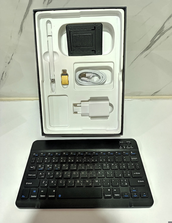 اقلام همراه:کیف/کاور/کیبورد/قلم/پایه نگهدارنده/شارژر/تبدیل تایپ سی به USB جهت اتصال فلش و هارد